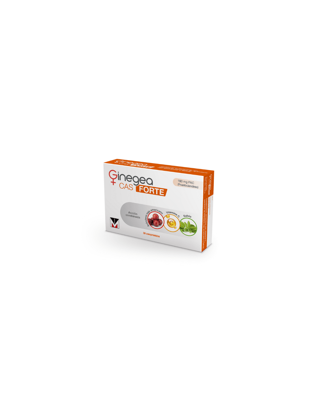 Ginegea CAS FORTE es un complemento alimenticio que contiene vitamina C, extracto de arándano rojo americano con 180 mg de proantocianidinas y extracto de salvia.
